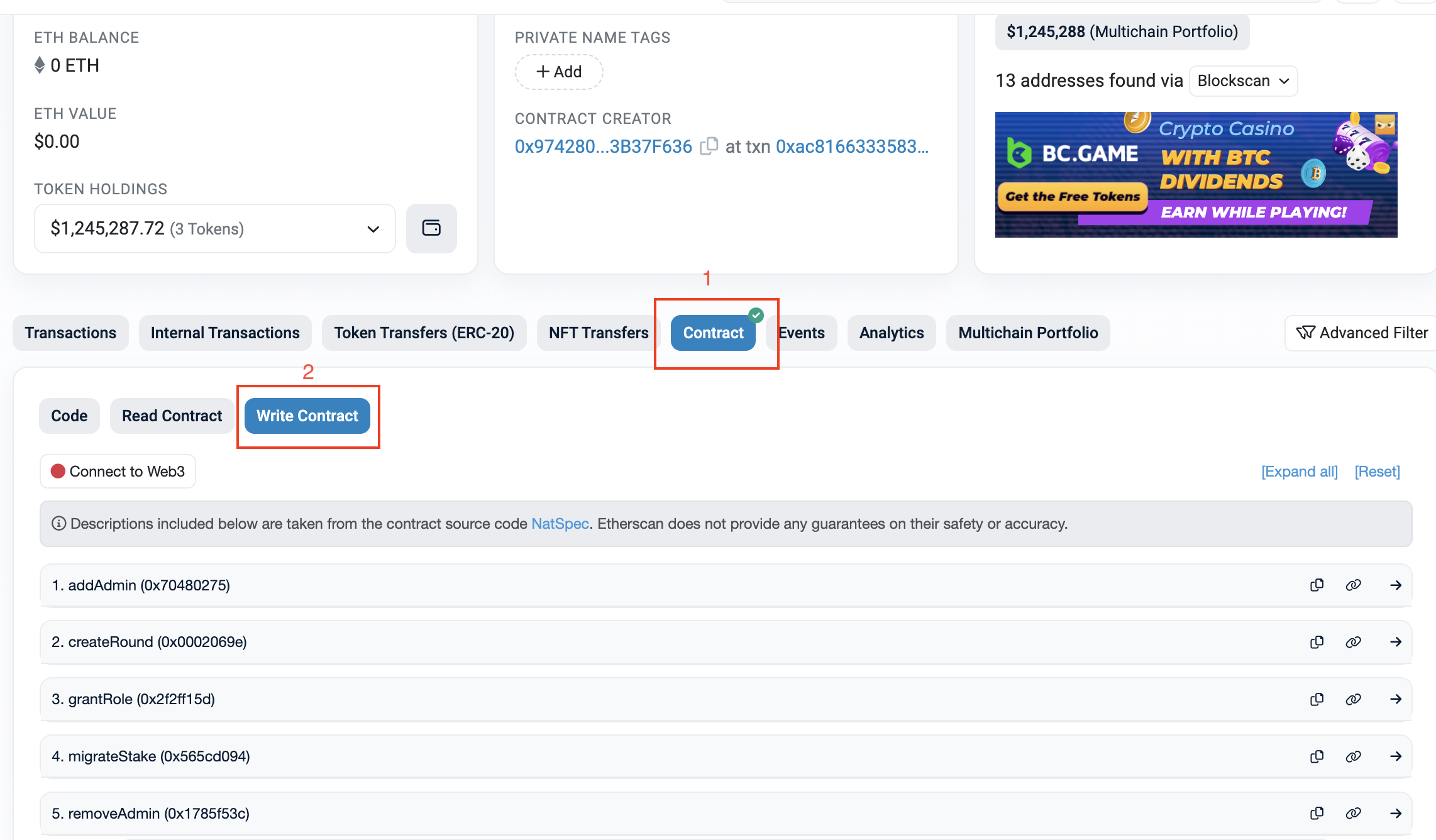 In the "Write Contract" tab on Etherscan, connect your Ethereum wallet using WalletConnect. <img src="https://2146253292-files.gitbook.io/~/files/v0/b/gitbook-x-prod.appspot.com/o/spaces%2FHyhSiCXoxRpn79voKZ4f%2Fuploads%2Fk4c2IRWcNGnXT2rn6Wpy%2Fimage.png?alt=media&#x26;token=ff19b558-4e56-42aa-8c0a-cb904a4161b5" alt="" data-size="original">